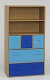 What a perfect storage unit for a boys room. The large storage bookcase top come with a durable vacuum formed surface with gently rolled edges. This unit is able to hold up to a 20-inch TV. The interior 2-shelves are great storage for kids awards, games, or whatever your needs might be. The foldable 3 medium size navy and light blue canvas drawers are great for holding your games, controllers, clothes etc. The 2-large canvas drawers at the bottom are additional storage for clothes, school supplies, etc. The drawers rest gently on the shelf and have canvas handles on both sides of the drawer for removing, or pulling completely out and taking with you to another room in the house. Constructed of composite board and highly durable PVC laminate. Clean with a dry non abrasive cloth. Assembly required. Read more